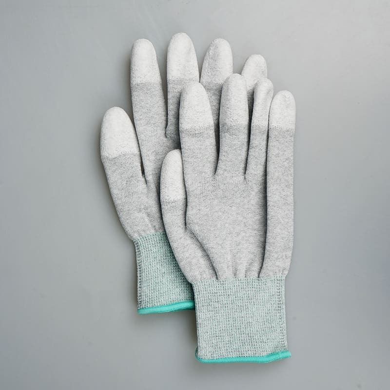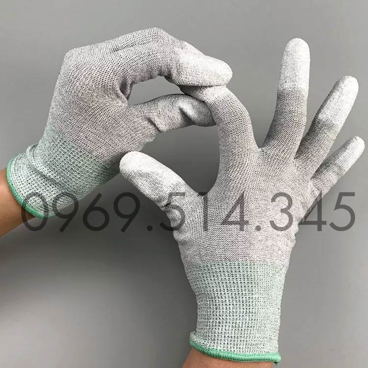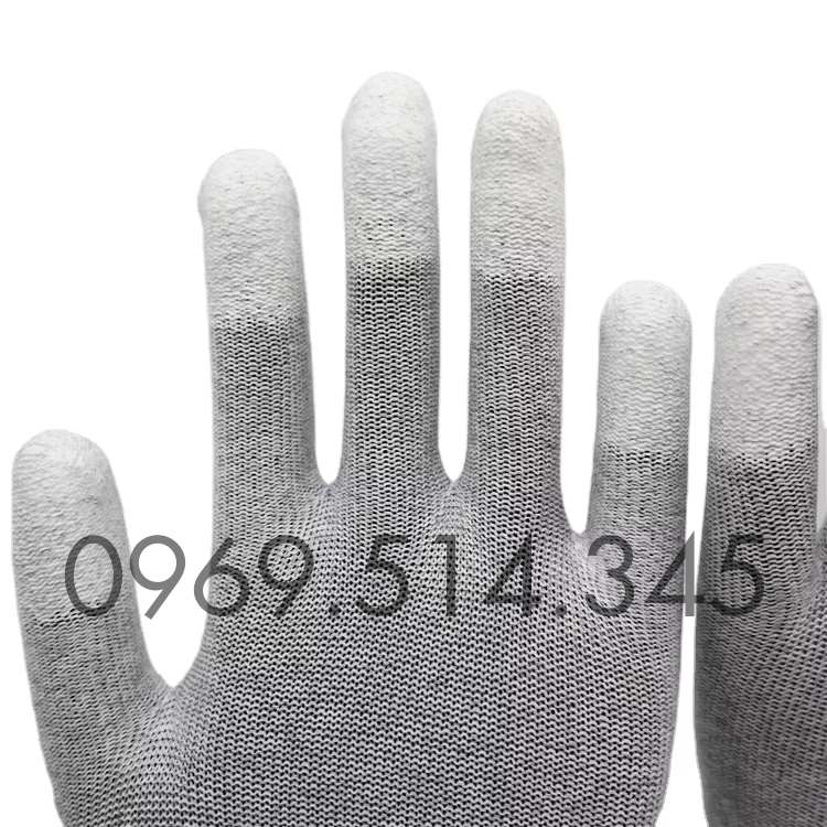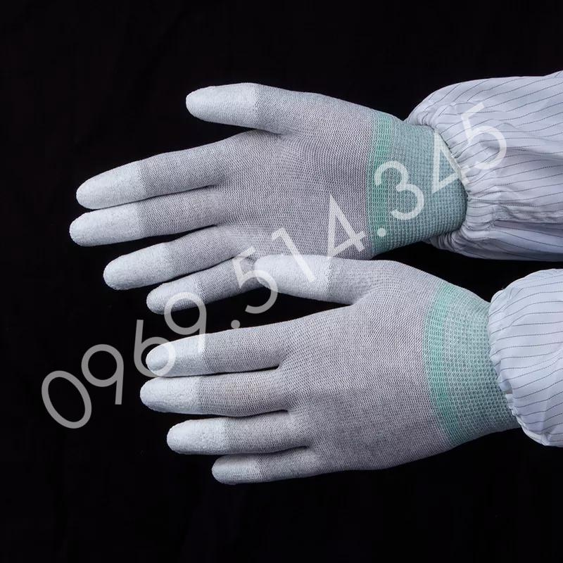 - Găng tay sợi carbon chống tĩnh điện phủ PU đầu ngón hay còn gọi là bao tay ESD phủ PU đầu ngón, găng tay chống tĩnh điện carbon phủ ngón có tên tiếng anh là ESD Gloves là một loại găng tay chống tĩnh điện được làm từ chất liệu vải polyester pha lẫn sợi carbon và được phủ lớp nhựa PU ở vị trí đầu các ngón tay.