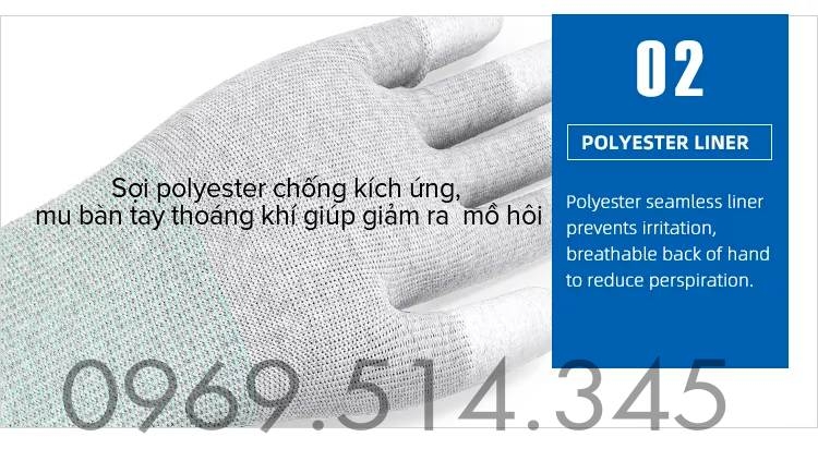 - Lớp phủ PU (Polyurethane) có độ đàn hồi cao, giúp găng tay ôm sát vào tay, thao tác linh hoạt.