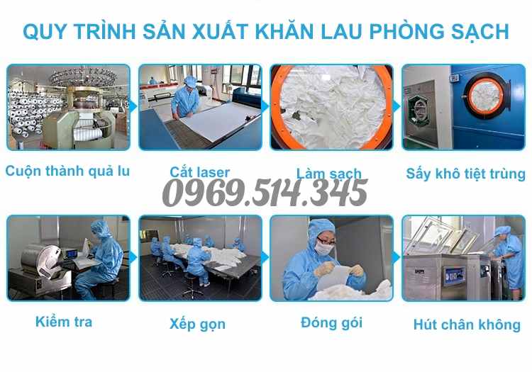 - Để sản xuất Khăn lau phòng sạch đạt tiêu chuẩn khắt khe, từ khi bắt đầu đến khi ra sản phẩm cuối cùng trải qua rất nhiều công đoạn. Trong hình ảnh dưới đây, chúng tôi cố gắng liệt kê những công đoạn chính. Để biết thêm chi tiết về Quy trình sản xuất Khăn lau phòng sạch, quý vị có thể tham khảo DƯỚI ĐÂY