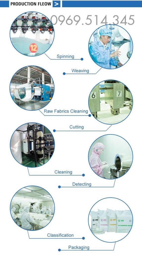 - Để sản xuất Khăn lau phòng sạch đạt tiêu chuẩn khắt khe, từ khi bắt đầu đến khi ra sản phẩm cuối cùng trải qua rất nhiều công đoạn. Trong hình ảnh dưới đây, chúng tôi cố gắng liệt kê những công đoạn chính. Để biết thêm chi tiết về Quy trình sản xuất Khăn lau phòng sạch, quý vị có thể tham khảo DƯỚI ĐÂY
