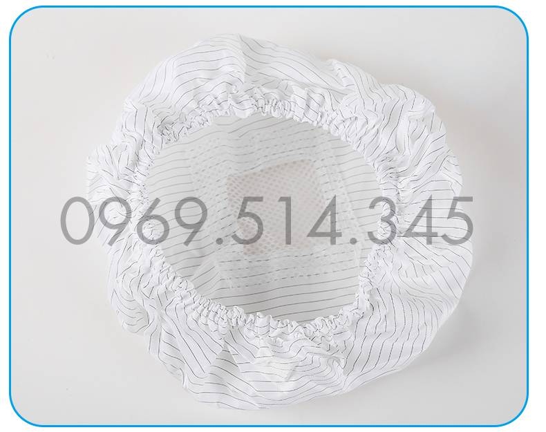 Mũ phòng sạch được may từ vải chống tĩnh điện- sợi polyester đan xen sợi carbon, khoảng cách giữa các sợi carbon là 5mm.