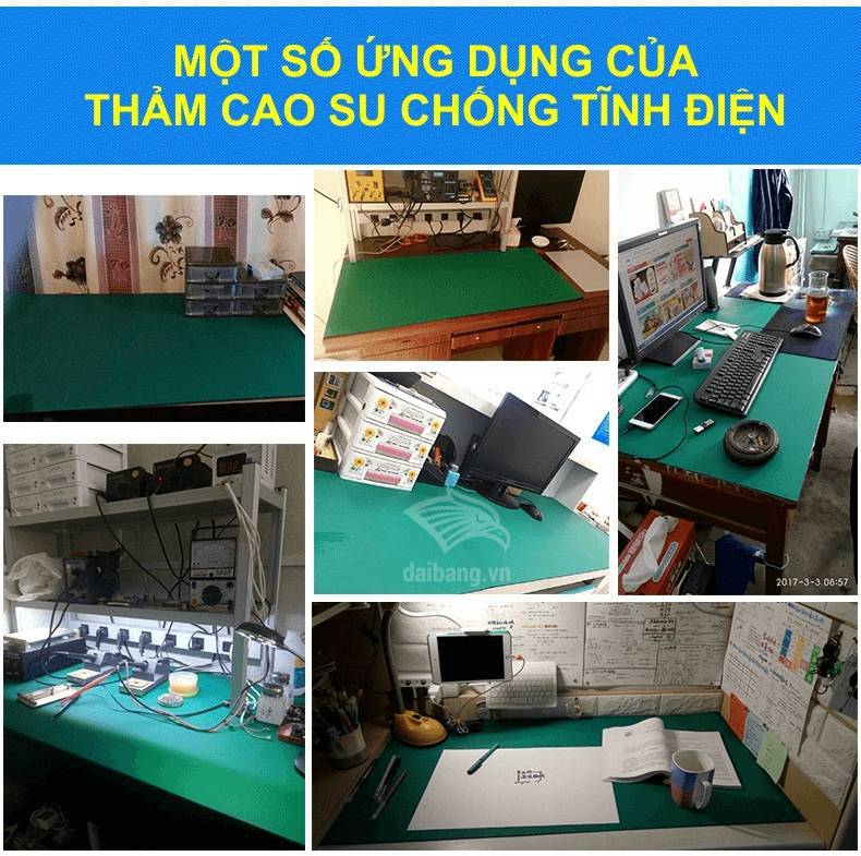 - Tấm thảm cao su chống tĩnh điện Rubber Mat được nhiều nhà dính trên bề mặt bàn học, bàn máy tính nhằm đảm bảo không bị dẫn chuyền điện đối với cơ thể con người. Ngăn ngừa bụi bám vào bề mặt xe sơn, đảm bảo chất lượng lớp sơn.